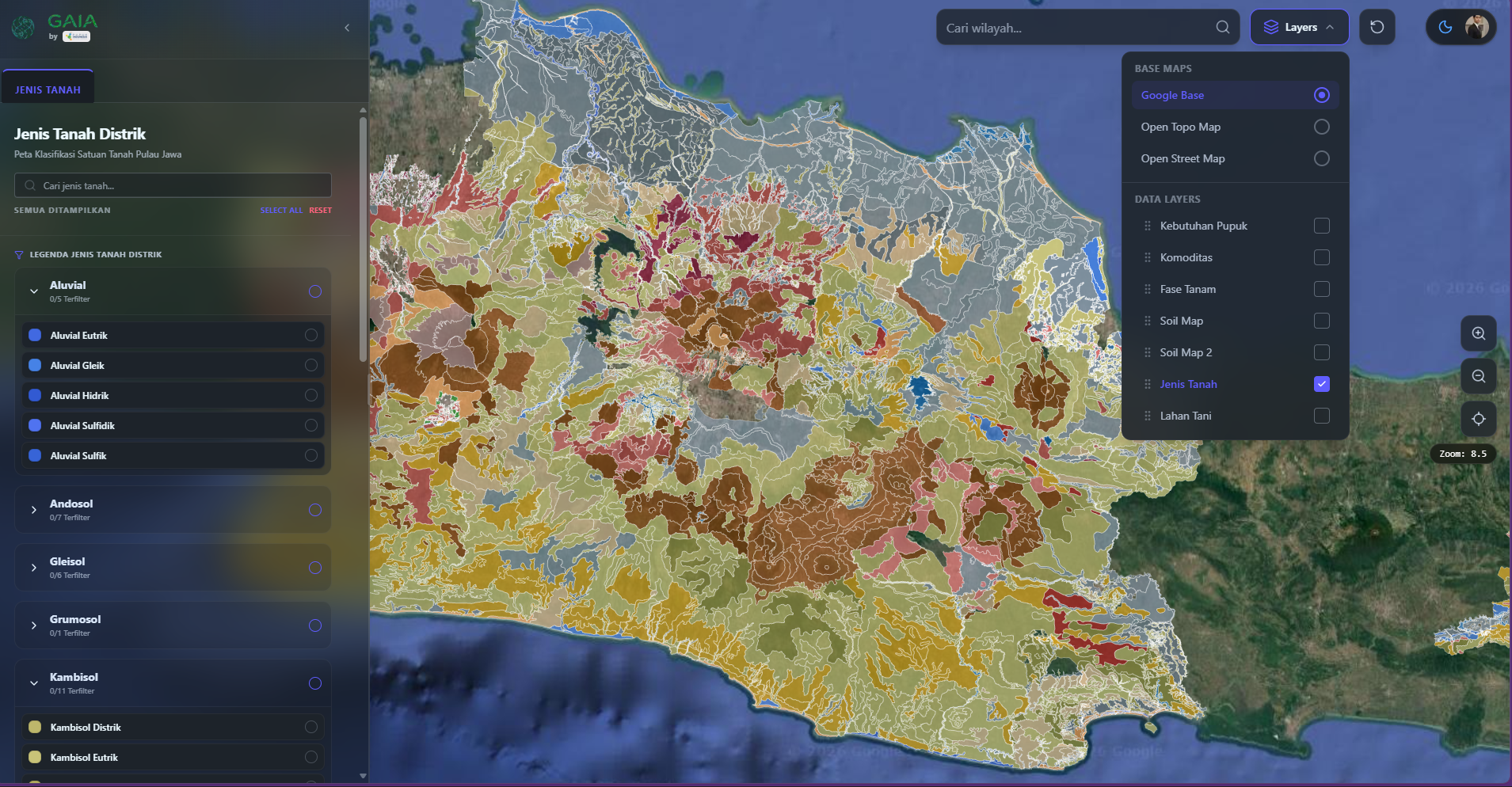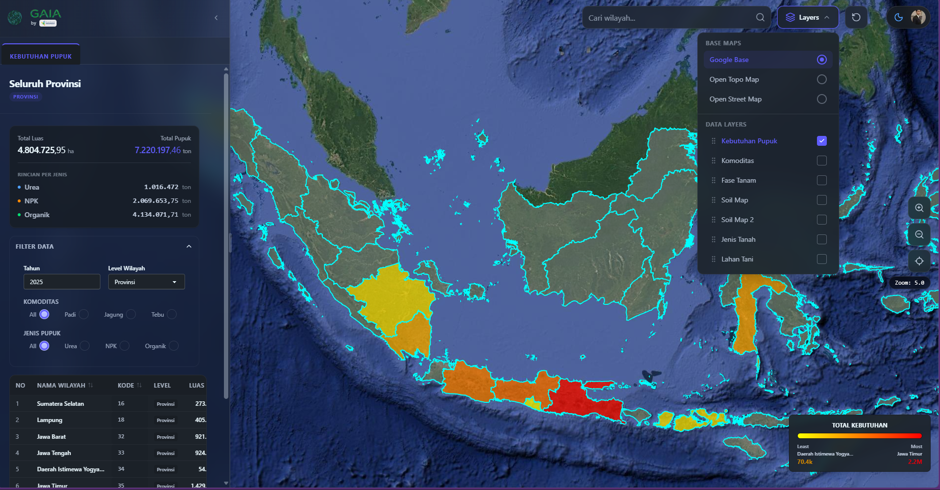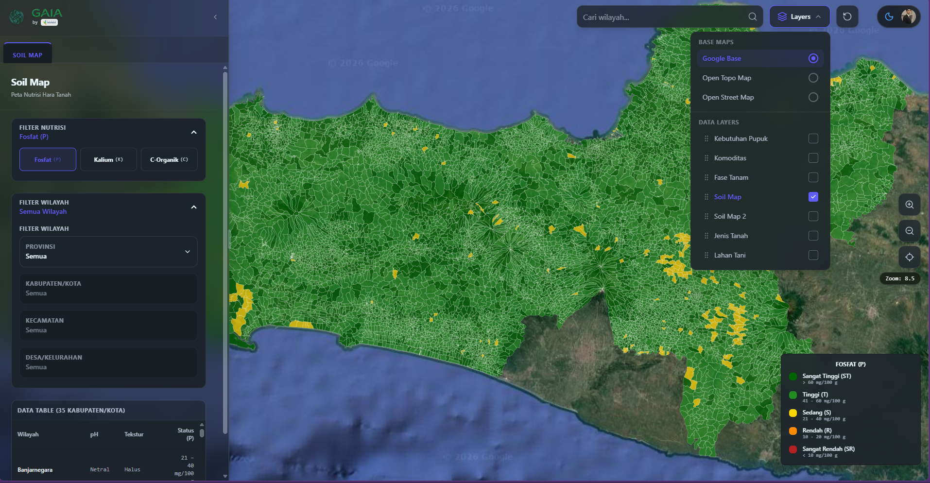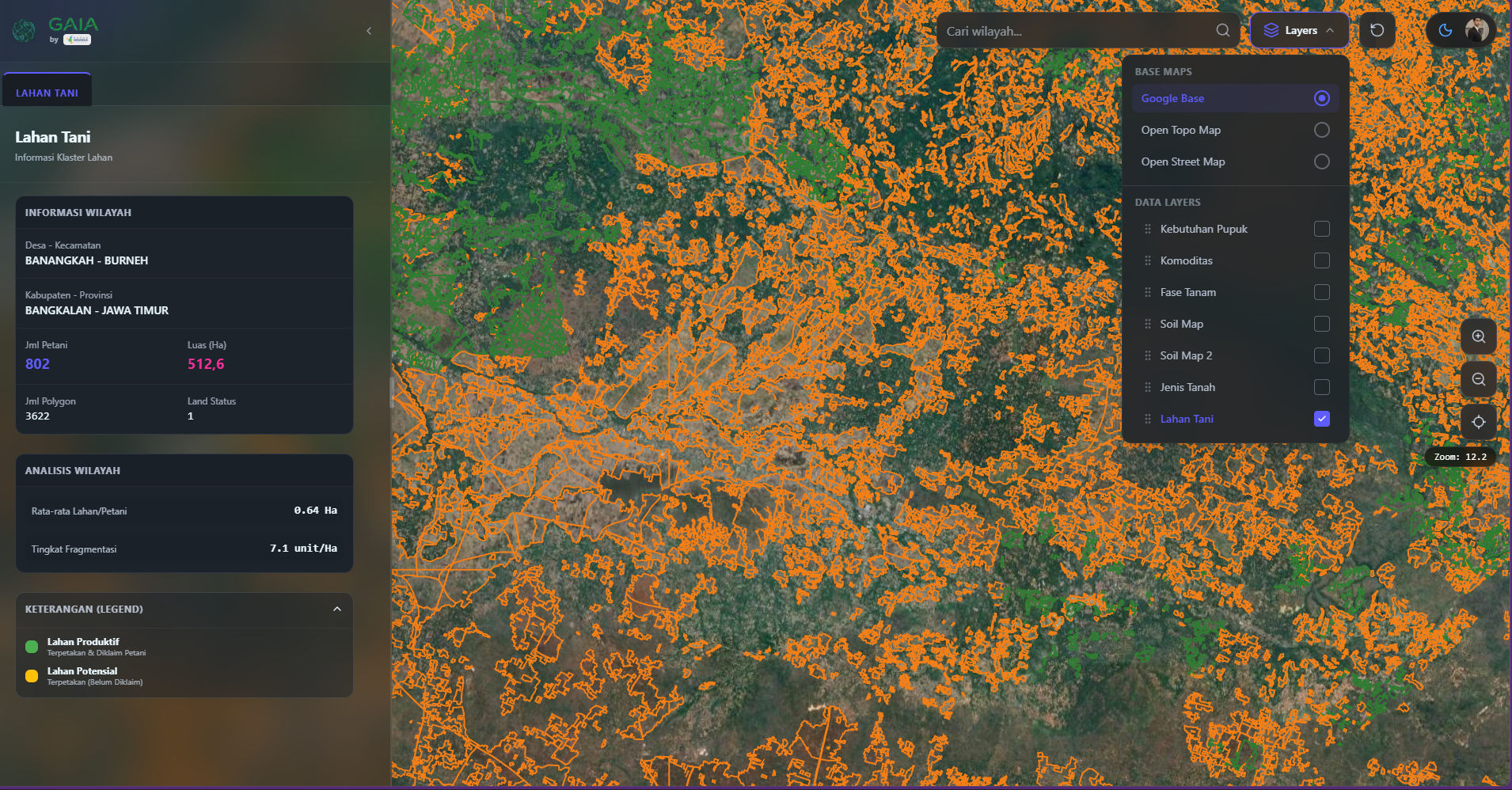 Multi-dimensional Data Layers: Kebutuhan Pupuk, Komoditas, Fase Tanam, Soil Map, Soil Map 2, Jenis Tanah, Lahan Tani